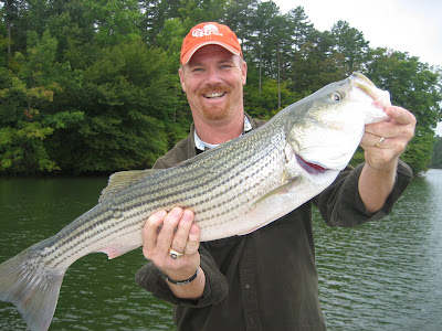Since I had a hard time yesterday catching bait I was on the water very early looking for bait. Caught 220 and picked the guys up at High Point at 5:30am. I told them how important it is to deploy the baits exactly like I tell them to and showed them how to do it. I also explained that if they listen to me and do exactly what I say, we should catch 50 Stripers before they shut off which lately has been around 9 o'clock. I looked for about 5 minutes and found a huge school. As it always is on our first set up of the morning everyone is slow and making mistakes, the way I fish is different than what people are accustomed to. We tried to get 10 baits in the water but the fish would not let us, then David threw a 25" fish back in the water. I explained to them that this time of year when the stripers are schooled tightly that if you release that size fish back into the school it alerts the rest of the school and the school will disperse and shut down. I had no sooner said that and the depth finder went blank. These guys were quick learners so we pulled our baits up and went in search of another school. Took about 3 minutes to locate another school, set up on them and caught 7. Lost them, looked for 3 more minutes and found another school and this time the guys were ready, we worked on that school for 25 minutes before 2 guys in a small boat saw us catching fish and pulled up on us, so we gave them that school and went and found another. This school ended up being larger than I thought and everyone hooked up at once, with 27 to 30 inch fish. We had fish going every direction , rods everywhere on the boat, fish all over the floor, then I called the ball, we had our limit in the cooler and had to stop. Not bad timing, we had gone through 200 baits, caught at least 30 keepers and a few non keepers, kept 20 Stripers and released the rest to fight again another day. These guys SPANKED the Stripers this morning , all by 8:15, A GREAT DAY OF FISHING!
